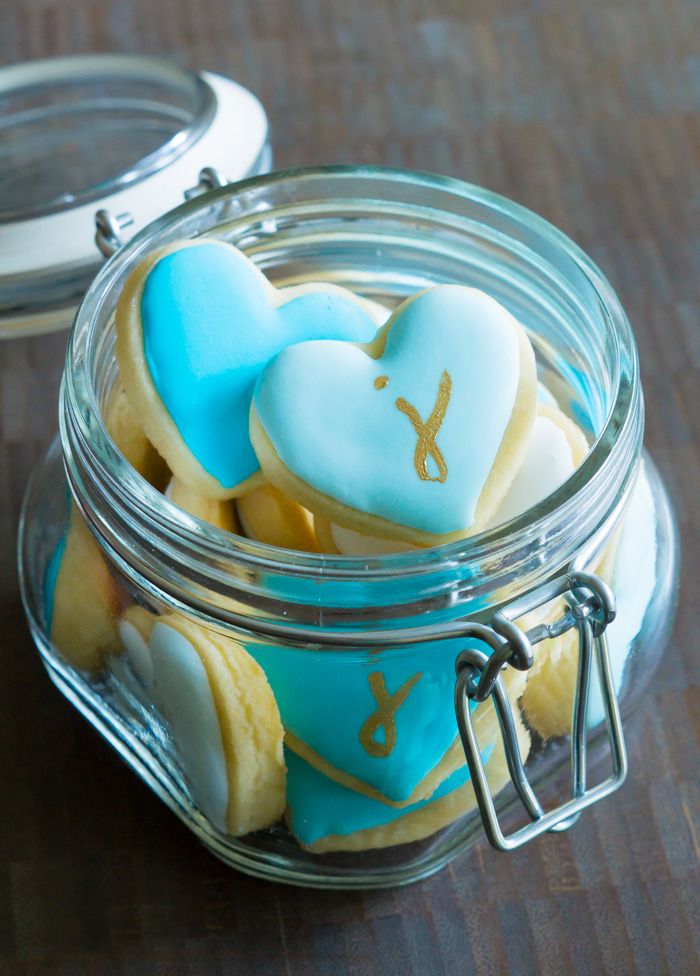 Mini ombre heart cookies, all in shades of baby blue. Those lightest ones look a little white in the photos, but I promise you, they have just the lightest tint of blue.