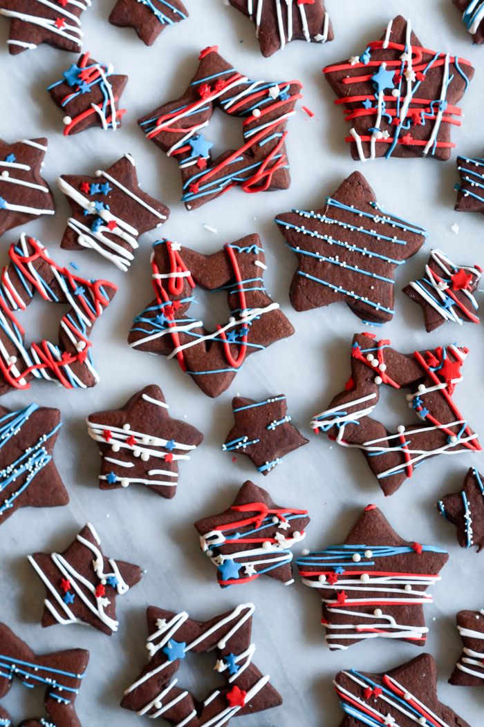 - Add sprinkles. I used a mix of small patriotic stars, sugar pearls and larger red and blue stars (from a jar of primary colored stars). I also used some white nonpareils on the blue-only cookies.